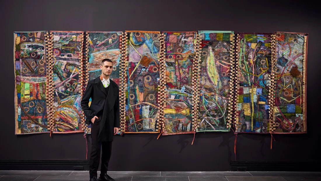 Drawing from his queer and Greek-Australian background, Gogos’s work spans textiles, design and runway shows and blends spontaneity with thoughtful material exploration. His process focuses on repurposing, recycling and sourcing deadstock textiles from friends and collaborators. Using techniques such as layering, compressing, felting and embroidery, Gogos’s creations evolve through chance, with form dictated by the interplay of materials.