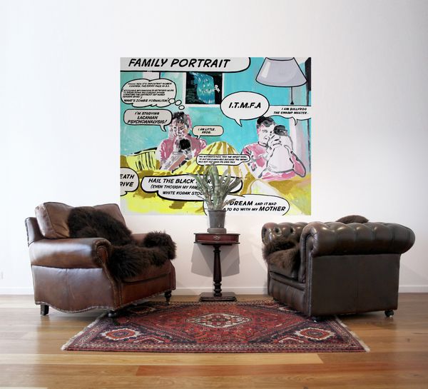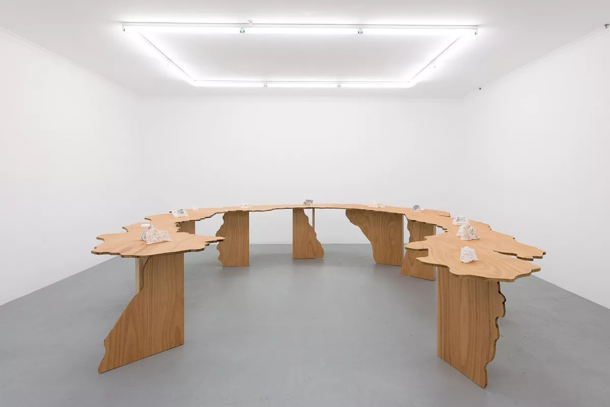 Originally painted in situ onto the walls at Gertrude Contemporary, 'Being Here is Everything (What a Pity)' has been reconfigured as a five piece panel.