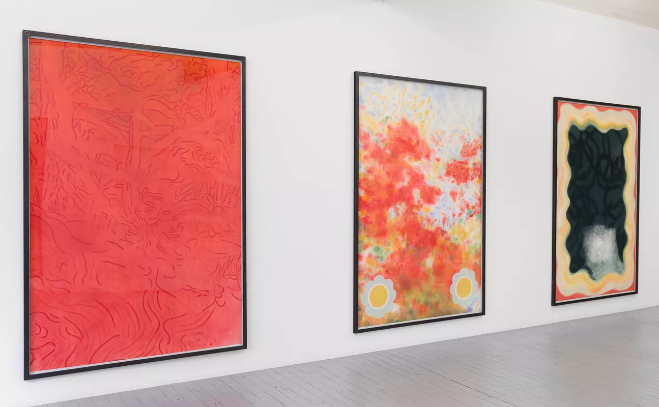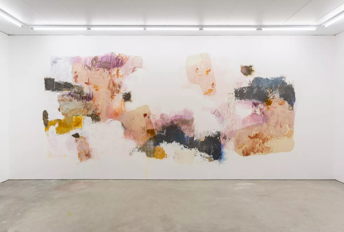 Using rudimentary mark-making with fingers and hands, masking, sponges and a vacuum cleaner, Nathan Hawkes’ triptych exemplifies his commitment to the exercise of drawing.