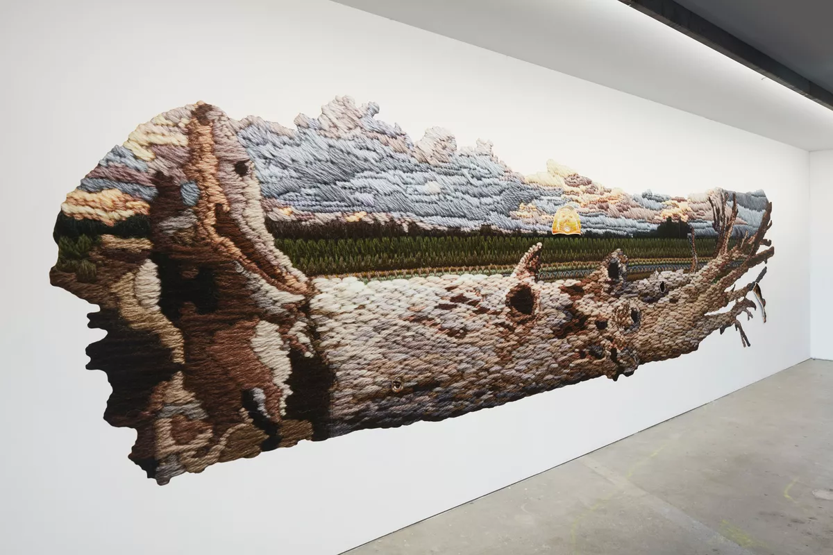 In 'Falling: Line by Line' Sera Waters has transformed an intimately scaled long-stitch into a seven-metre length of photographic wallpaper.