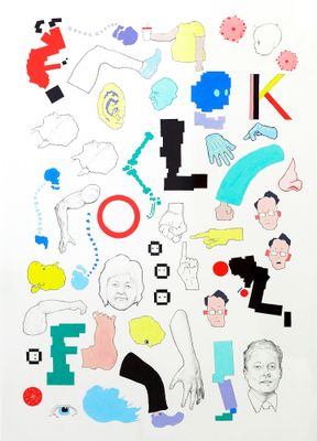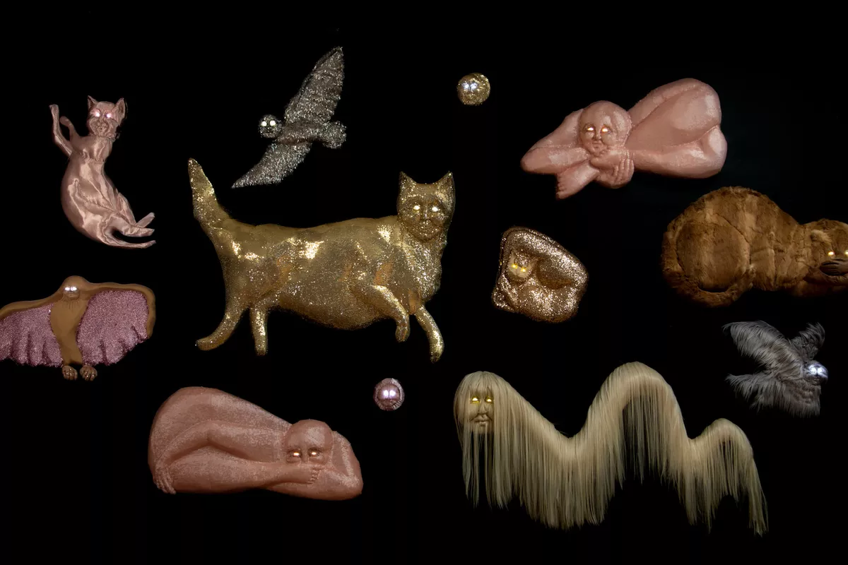 Tricksters presents a swarm of shape-shifting hand stitched figures that morph into self-portraits.
