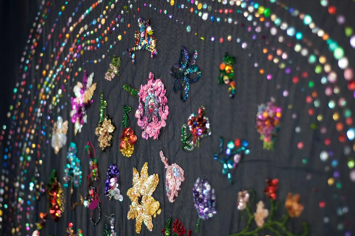 'Community participatory embroidery, Thoughts and Prayers' is an assemblage of embroidered flowers created by many hands in collaboration with Liam Benson.