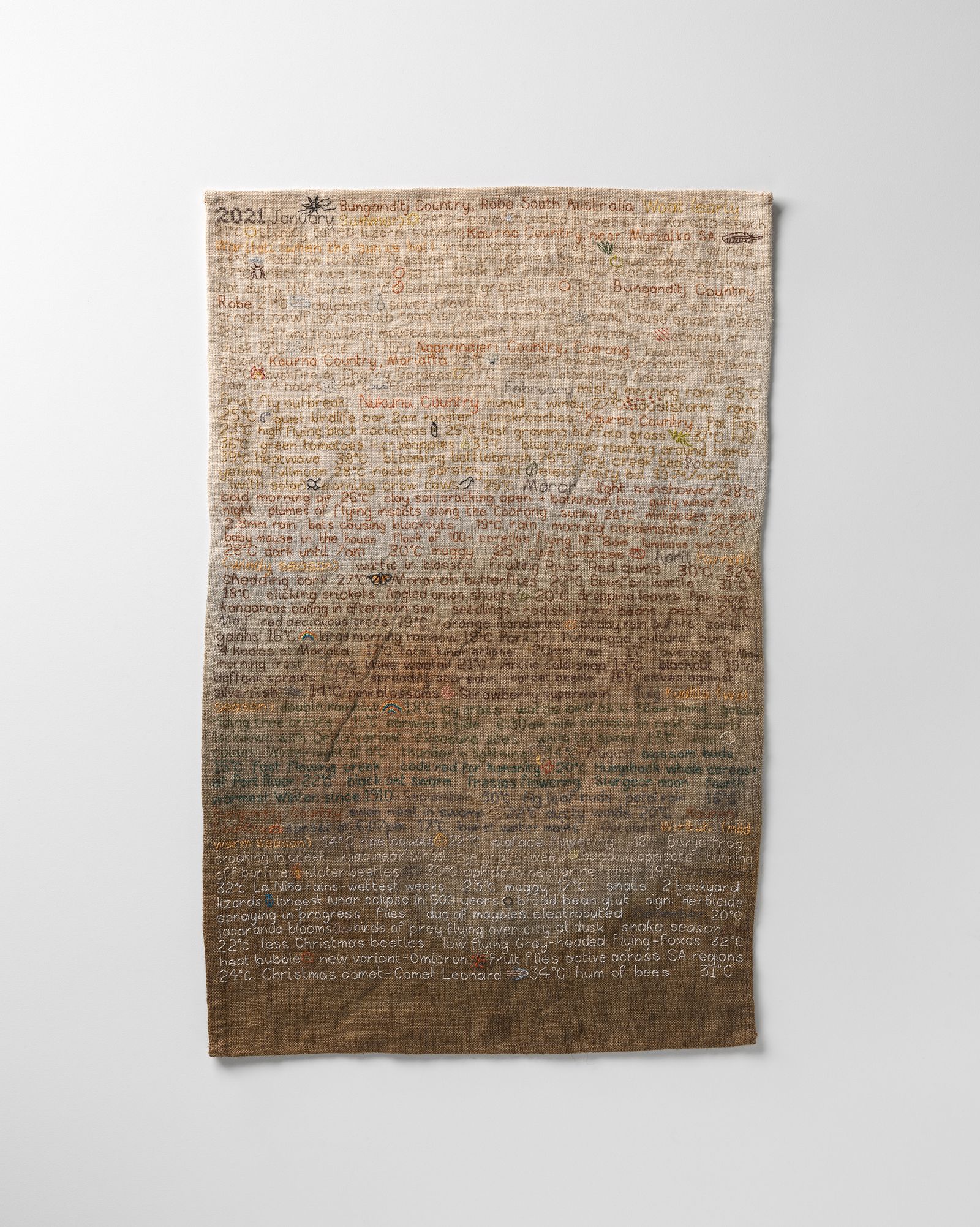 Waters is well known for her revival of endangered ways of making, whereby age-old embroidery techniques are restored to comment on our complex and often confronting colonial histories. In this exhibition, the past paves the way for a new future and by reclaiming the traditions that our great-great-great-grandmothers performed we can move, together, towards an alternative liveable future.