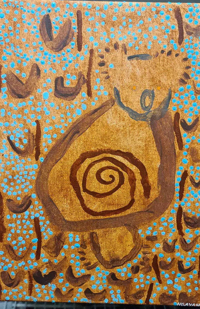 Congratulations Ngayan! Thank you for sharing this dreaming story. I really enjoyed how you’ve depicted the koala’s intestines / ‘magic string’ as well as the contrast between ochre and turquoise blue acrylic pain. Good job!