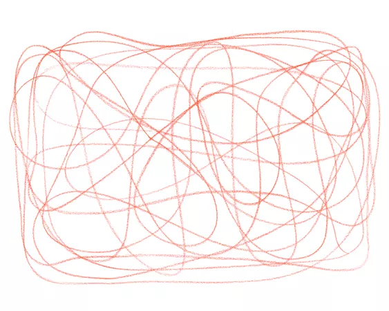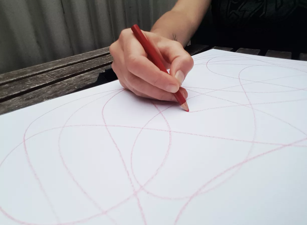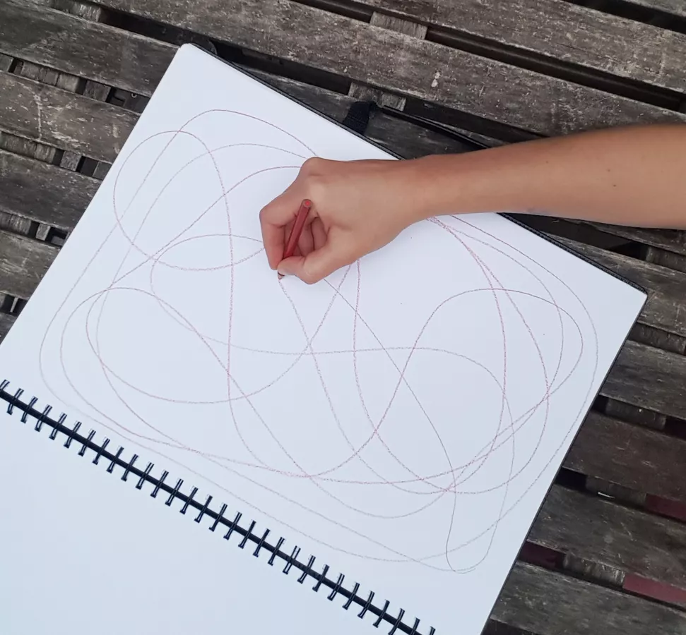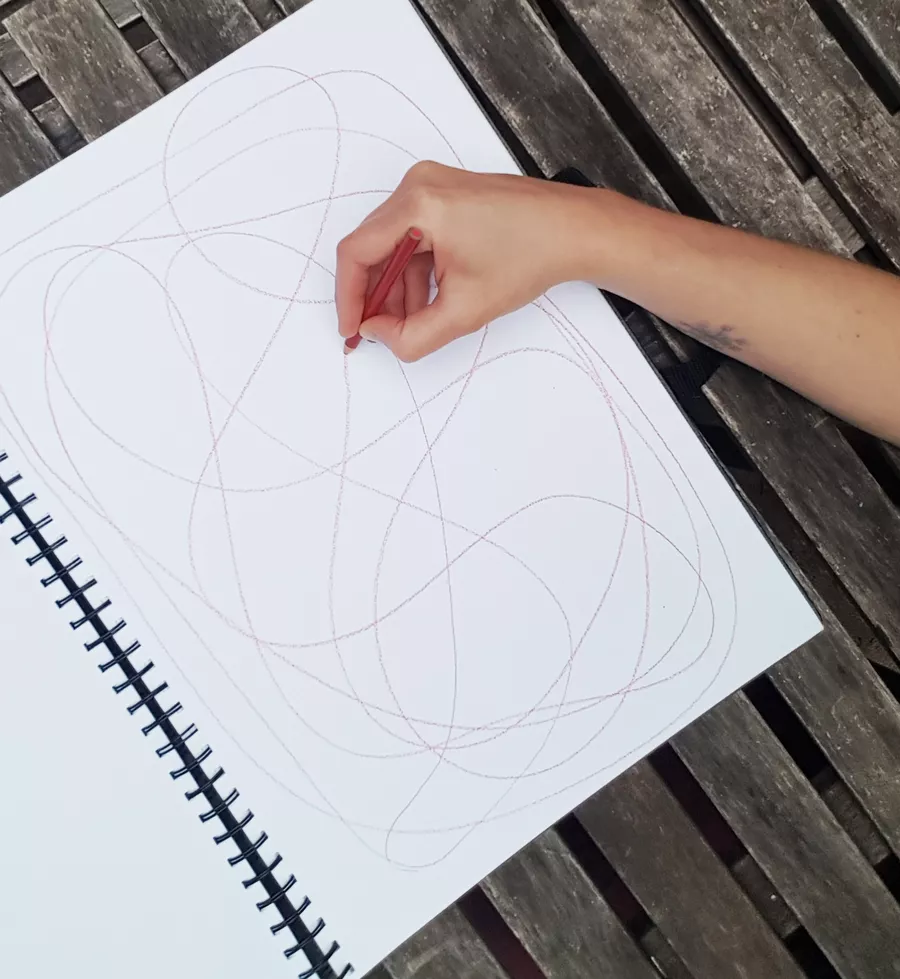 Place your piece of paper down on the table; pick up your red pencil and GO!! Start scribbling. Use the whole space on your paper to create big bold round lines, gestures and crazy curves. Allow yourself about 10-20 seconds of scribbling time before you stop.
