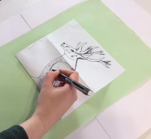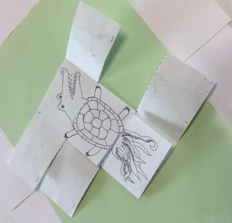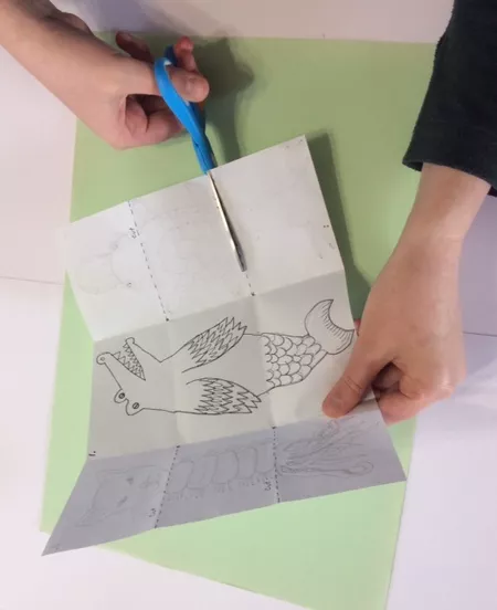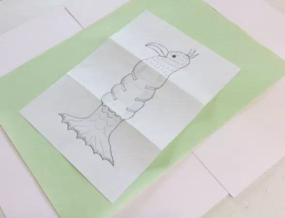 - Fold over and cover the middle drawing and draw a totally different hybrid creature. Make sure that the head is in the top third, body in the middle and tail/legs in the last section.