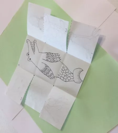 When everyone has finished middle drawing, fold so that it is hidden and pass around again and draw the tail, legs or fins.