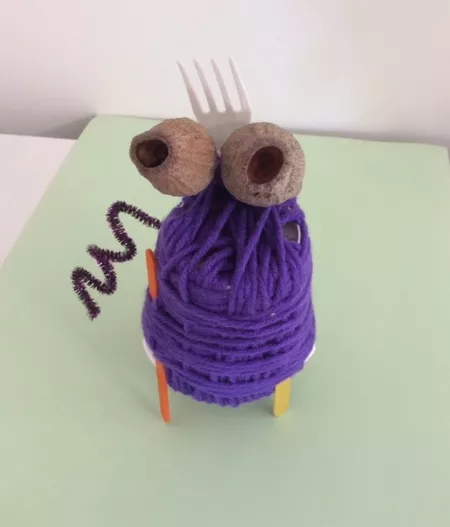 - To make monster I used a paper cup, a plastic fork, some coloured popsticks, a sparkly pipe cleaner, all held together, by wrapping with some wool.