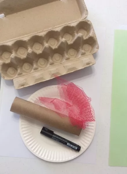 - To make my second monster, I used an egg carton, a cardboard roll, some red net from a fruit bag, a paper plate and a texta to draw the eyes.
