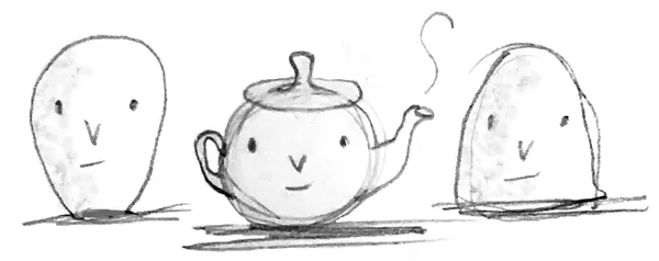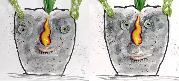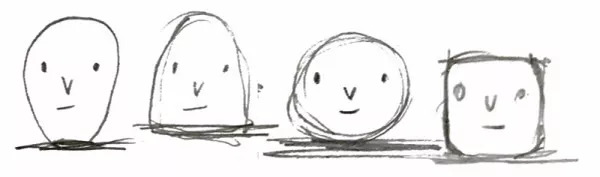 When planning these objects, Tom draws the outline and then tries many different arrangements of eyes, noses and mouths to find a pleasing character and expression.