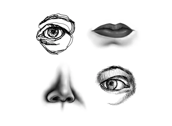 Draw facial features from a selected portrait work from the gallery, pay close attention to eyes, nose, mouth and even ears. Draw the all different size and in no particular order. You may want to use a different drawing style for each one as I have done below.