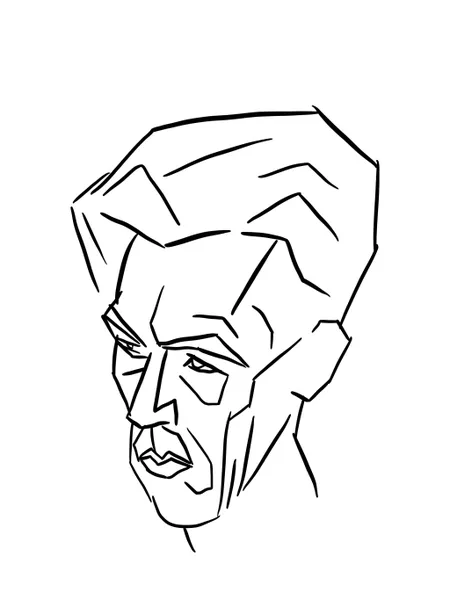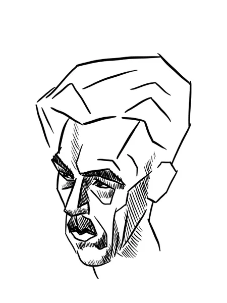 Select two portraits in the Galleries collection, one face with pointy features and another one with more round features. Now using your drawing materials draw the face as shapes! Here is an example of my pointy face, I used lots of triangles, line and hard edges, whereas when you draw the rounded one it will be more circular.