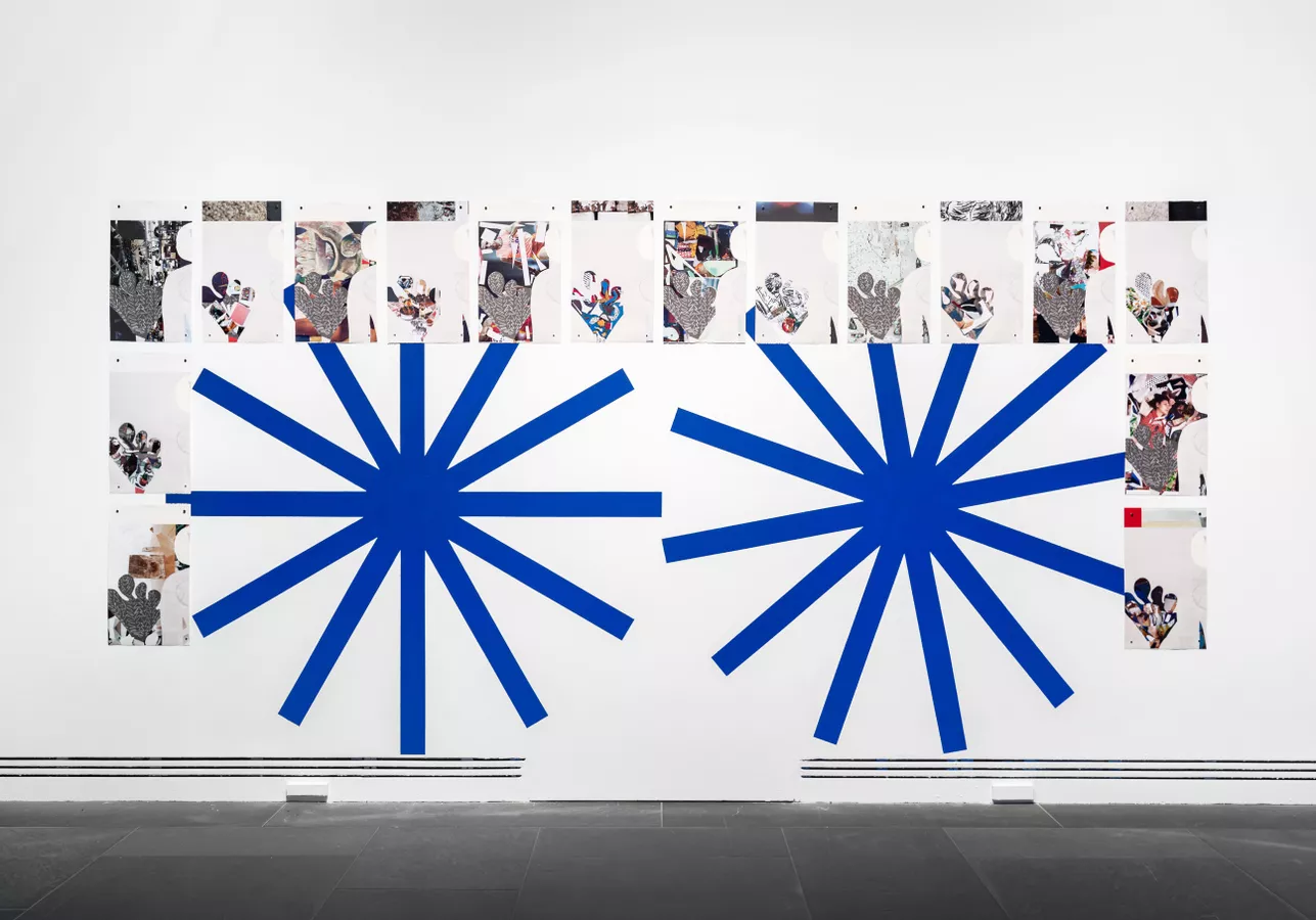 Two Clocks and Sixteen Shoulders is a site-specific wall painting and series of sixteen collages. The imagery includes a cropped section of Henri Matisse’s late ‘cut out’ work Zulma, 1950, which is then layered with found images on subjects ranging from art history to gourmet food. Through this iterative process, McLuckie comments on the circular perception of time, as opposed to common understandings of time as a linear experience. By juxtaposing art historical imagery with repetitive motifs, McLuckie also speaks to the proliferation and saturation of images in contemporary society.