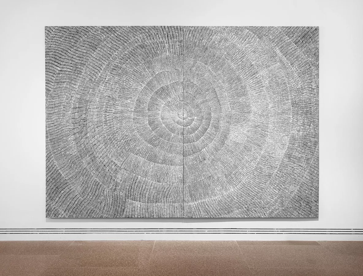 Weaving Myself: the Landscape and the Land was painted using two brushes, including one Karritpul made using his own hair, further placing himself in the painting. He uses the weaving process as a visual metaphor for land and landscape. As a Ngen'gi wumirri man, Karritpul is not permitted to weave, so instead he paints magnified views of woven objects and fibres. This painting is a magnified view of the woven surface that stands for the breathing lands of his Country. Karritpul feels he was born woven into the land and using repetition and line he creates a surface that moves like human breath.
