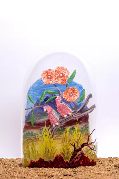 Artists from lltja Ntjarra Art Centre have partnered with the Canberra Glassworks to reinterpret the Hermannsburg School watercolour tradition through the medium of glass. Following a series of collaborative workshops in Mparntwe (Alice Springs), the Canberra Glassworks created glass ‘blanks’ that were sent to Mparntwe for artists to work on, and these were then returned to CGW for engraving and hand-finishing. The result is a spectacular series of blown glass vessels featuring the artists’ landscape paintings in a continuation of Albert Namatjira’s work. The collaboration follows an artist-led approach, focusing on stories and the curatorial rationale at Iltja Ntjarra Art Centre.