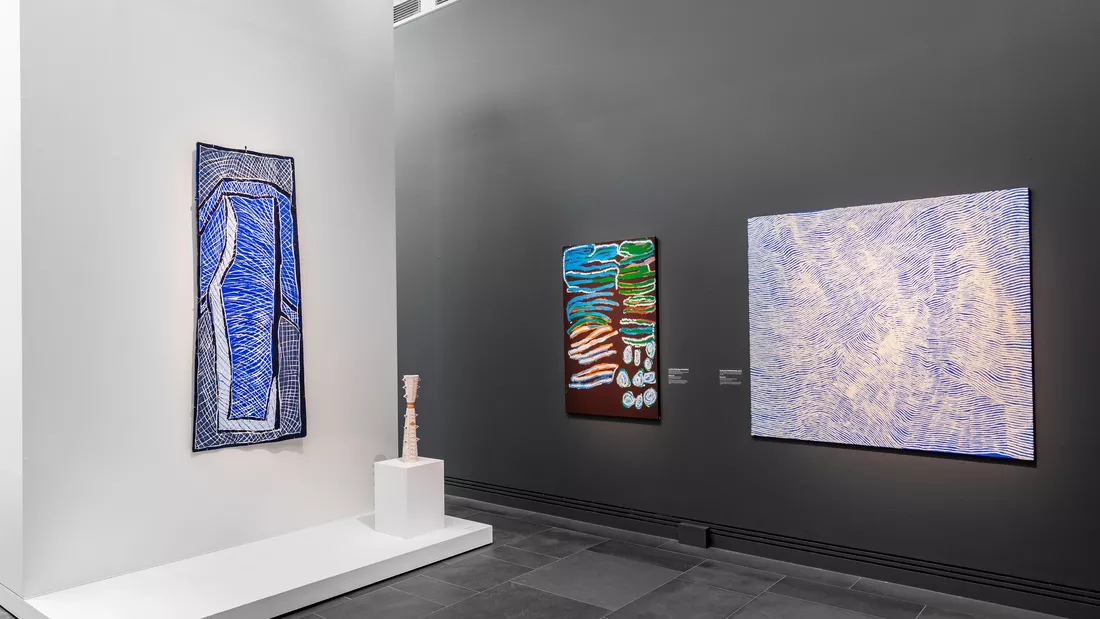Nici Cumpston, OAM, Artistic Director of Tarnanthi, Curator of Aboriginal and Torres Strait Islander Art, on Dhambit Mununggurr in Bewilderness Gallery 9.